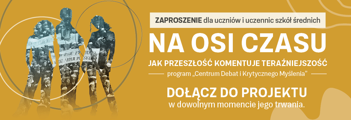 Zapraszamy uczniów i uczennice szkół średnich do udziału w naszym projekcie Na osi czasu. Jak przeszłość komentuje teraźniejszość w ramach programu Centrum Debat i Krytycznego Myślenia. Podczas spotkań: